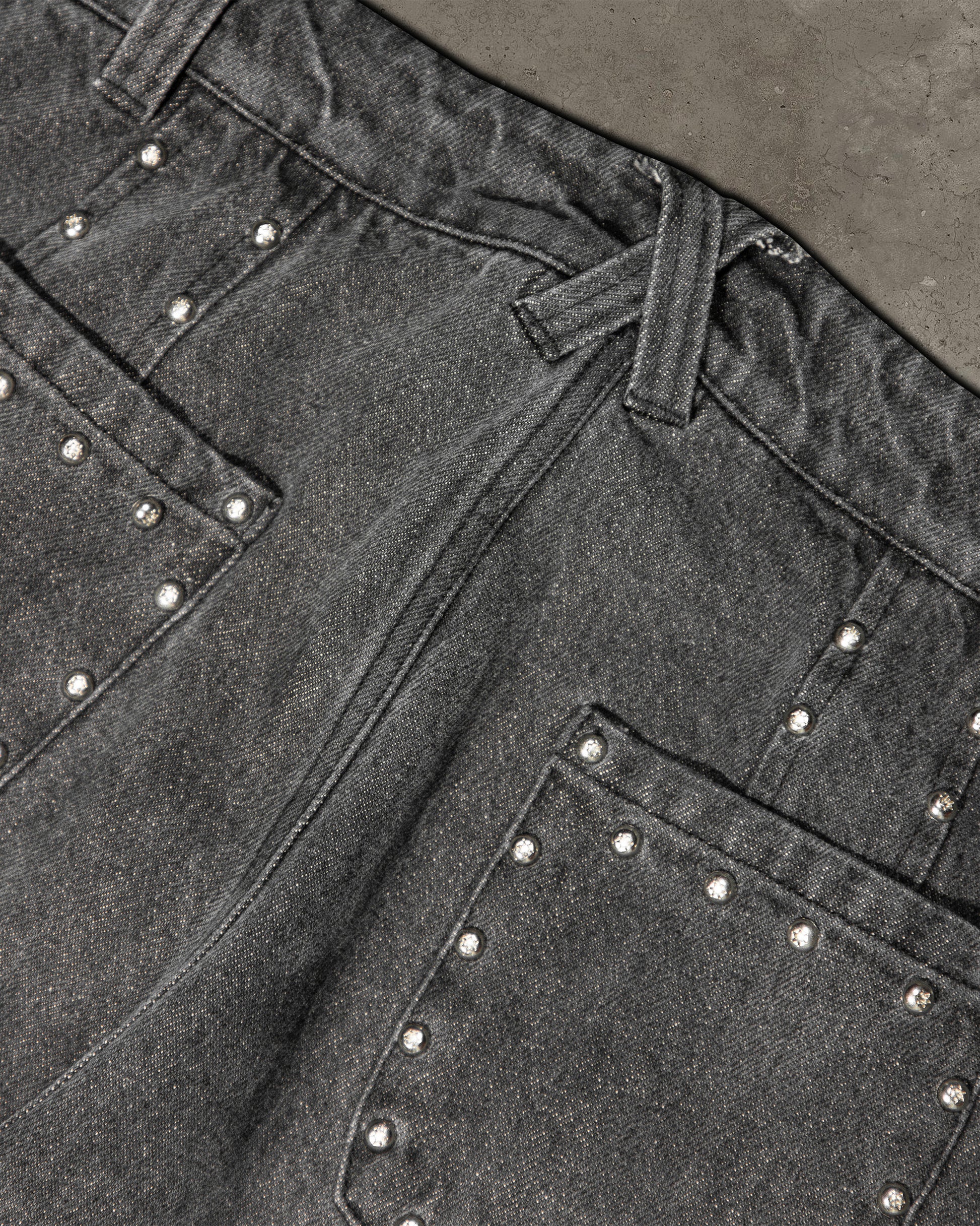 Iconaclub denim jeans with a faded wash featuring custom star pattern pins made to resemble the same Torx "star" screws found in BMW cars of all variations.